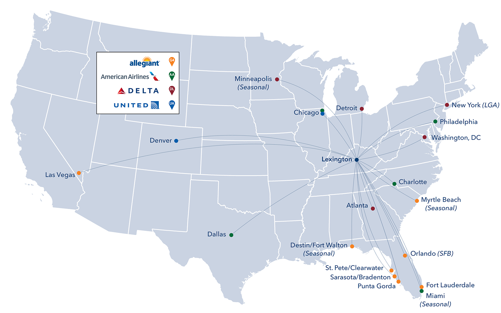 Blue Grass Airport offers non-stop flights to 19 destinations with convenient connecting service to business and leisure cities worldwide. Contact your airline today for reservations and additional information.